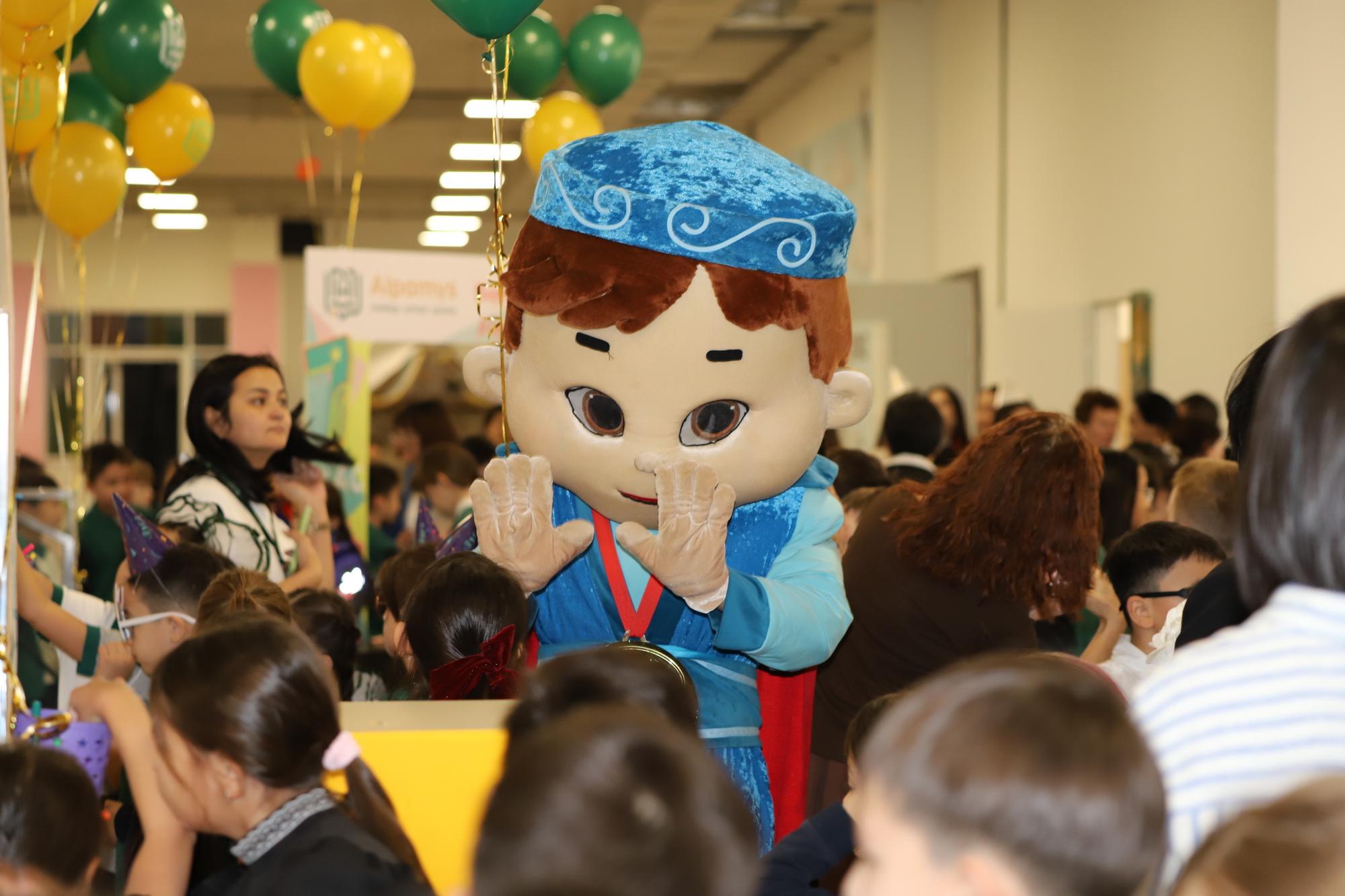 С самого утра учащихся ждал приятный сюрприз — у входа их встречал сам Алпамыс батыр, создавая атмосферу праздника и хорошего настроения.